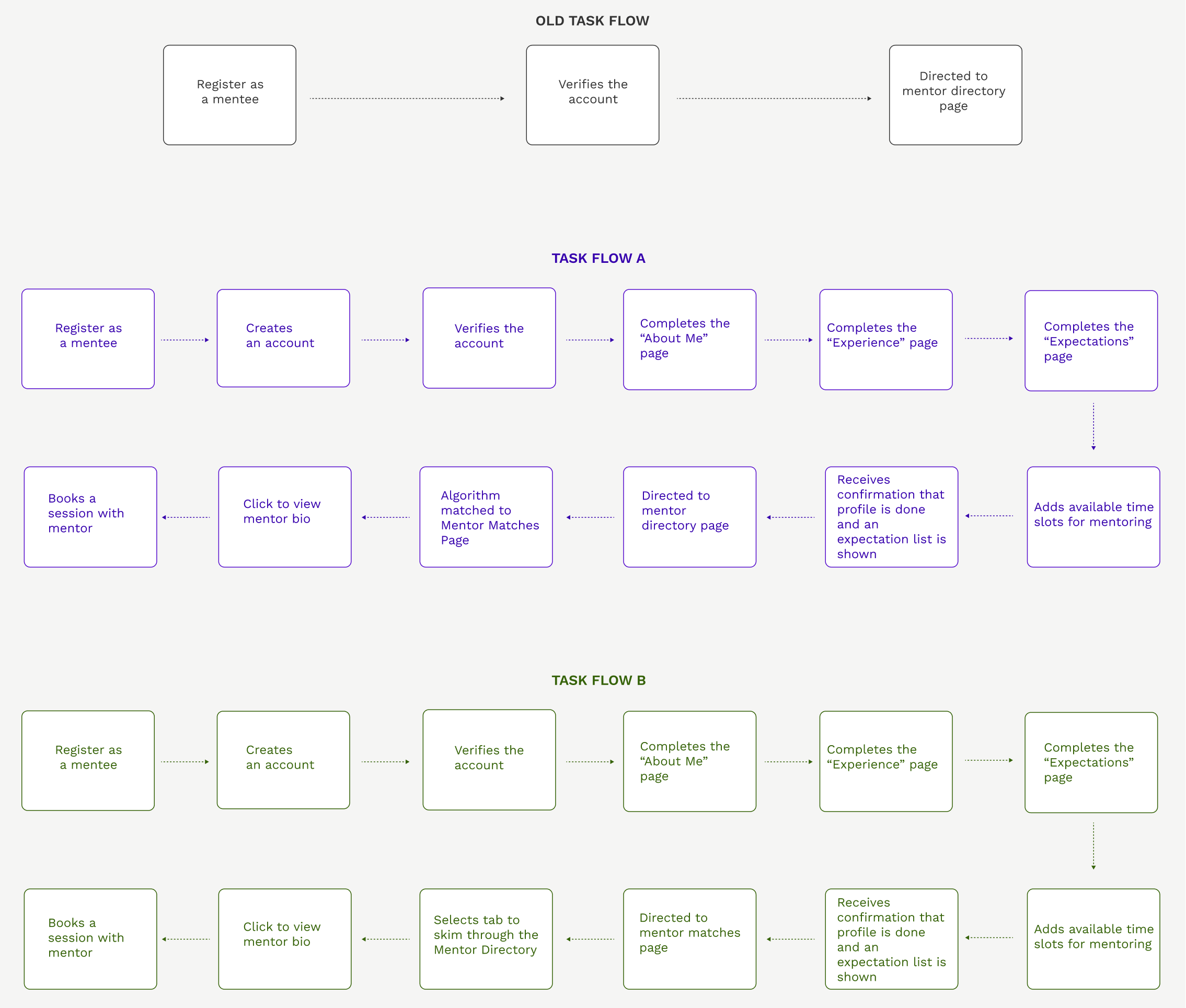 The old task flow didnβt have the correct verification flow and a mentee onboarding. Also, there were two ideas from my user interviews on hybrid matching. All are in task flows A and B. The client chose task flow A over B, so both were tested to see which users preferred and why.