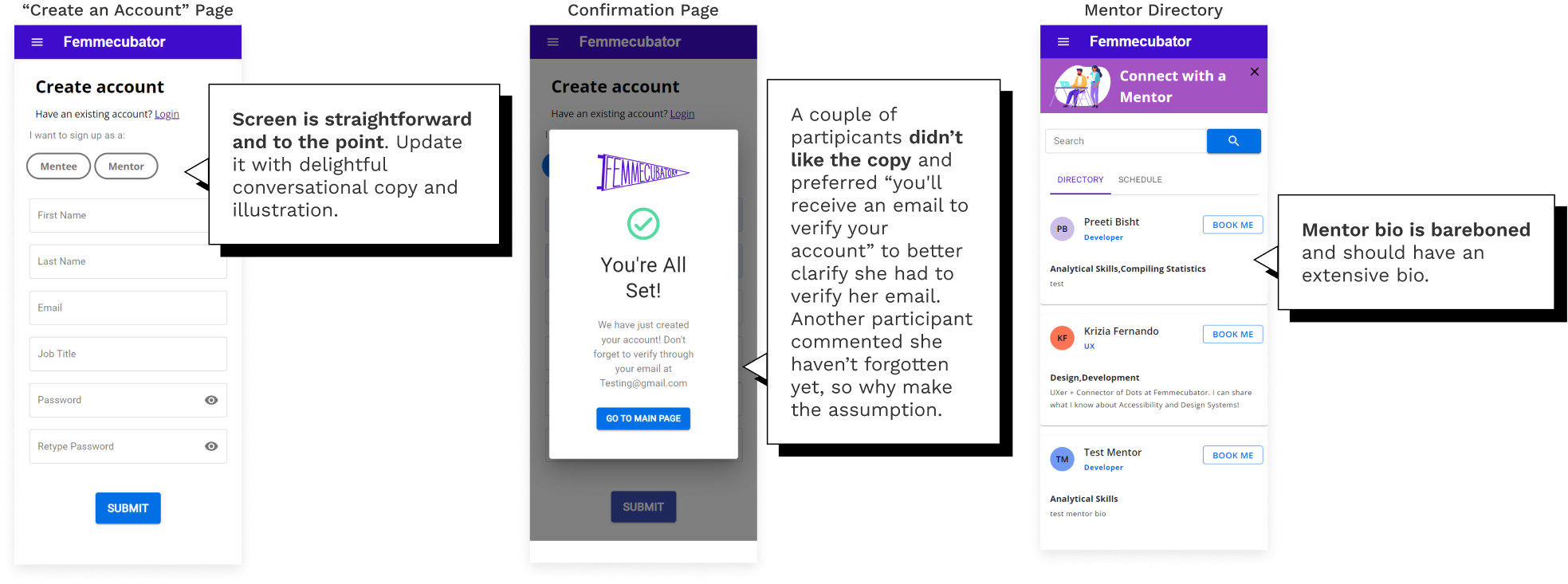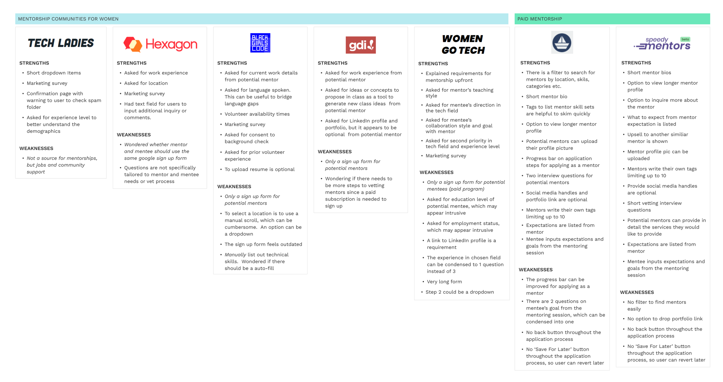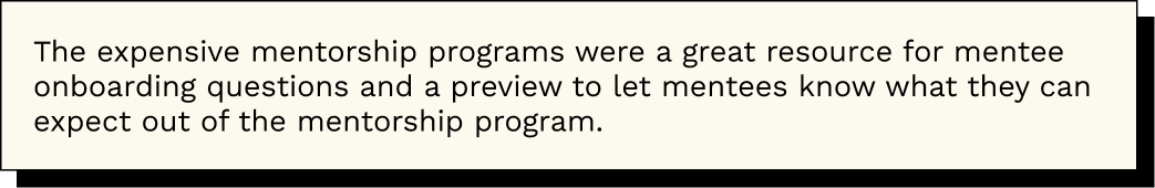 I began by looking for strengths and weaknesses in the onboarding of five mentorship communities similar to Femmecubator, which catered specifically to women or women of color in tech. Even though the onboarding for mentees and mentors should be different as both served different roles, 3 out of 5 of these communities had the same process for both. They also lacked the tools to help the mentors better understand the mentees. I refocused on pricey mentorship programs and found they had a more extensive onboarding.