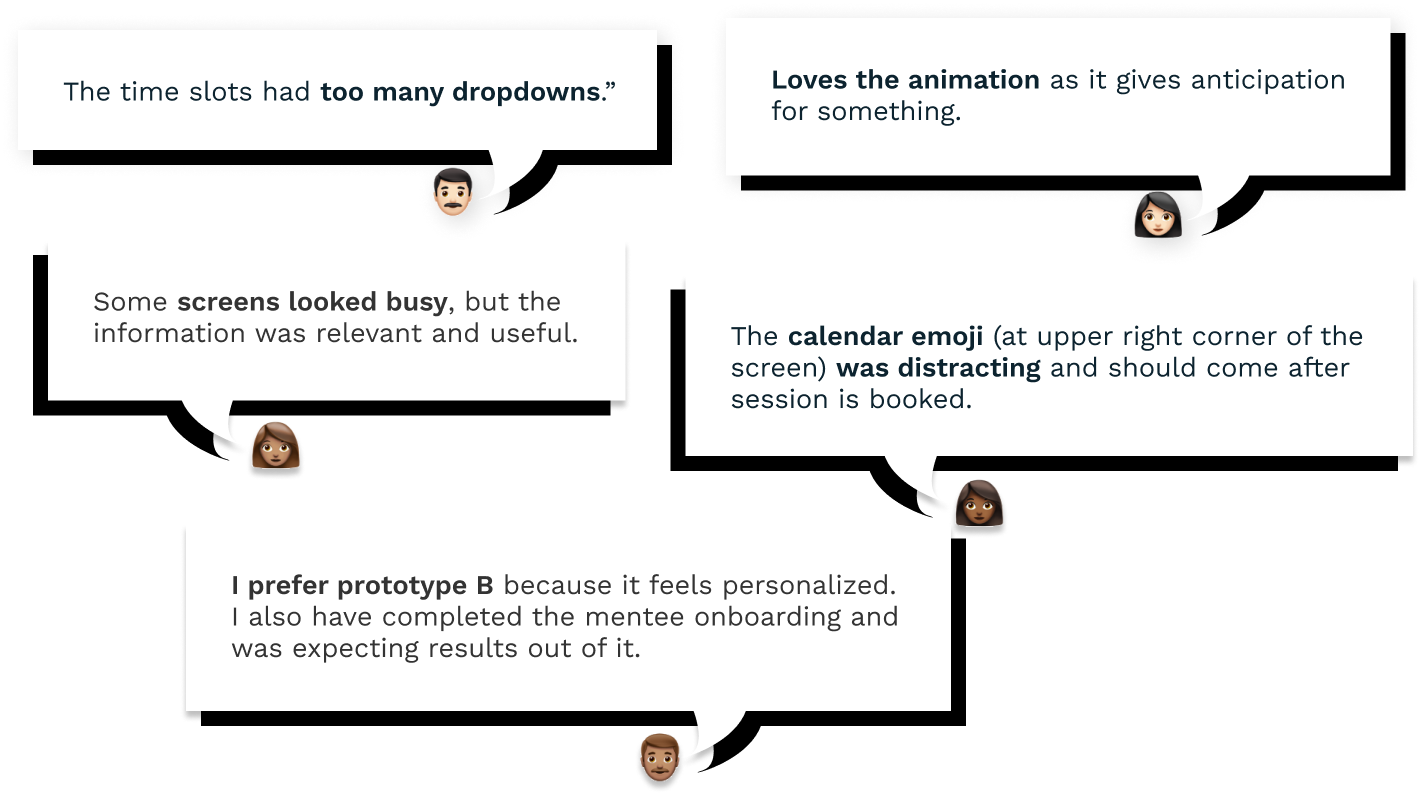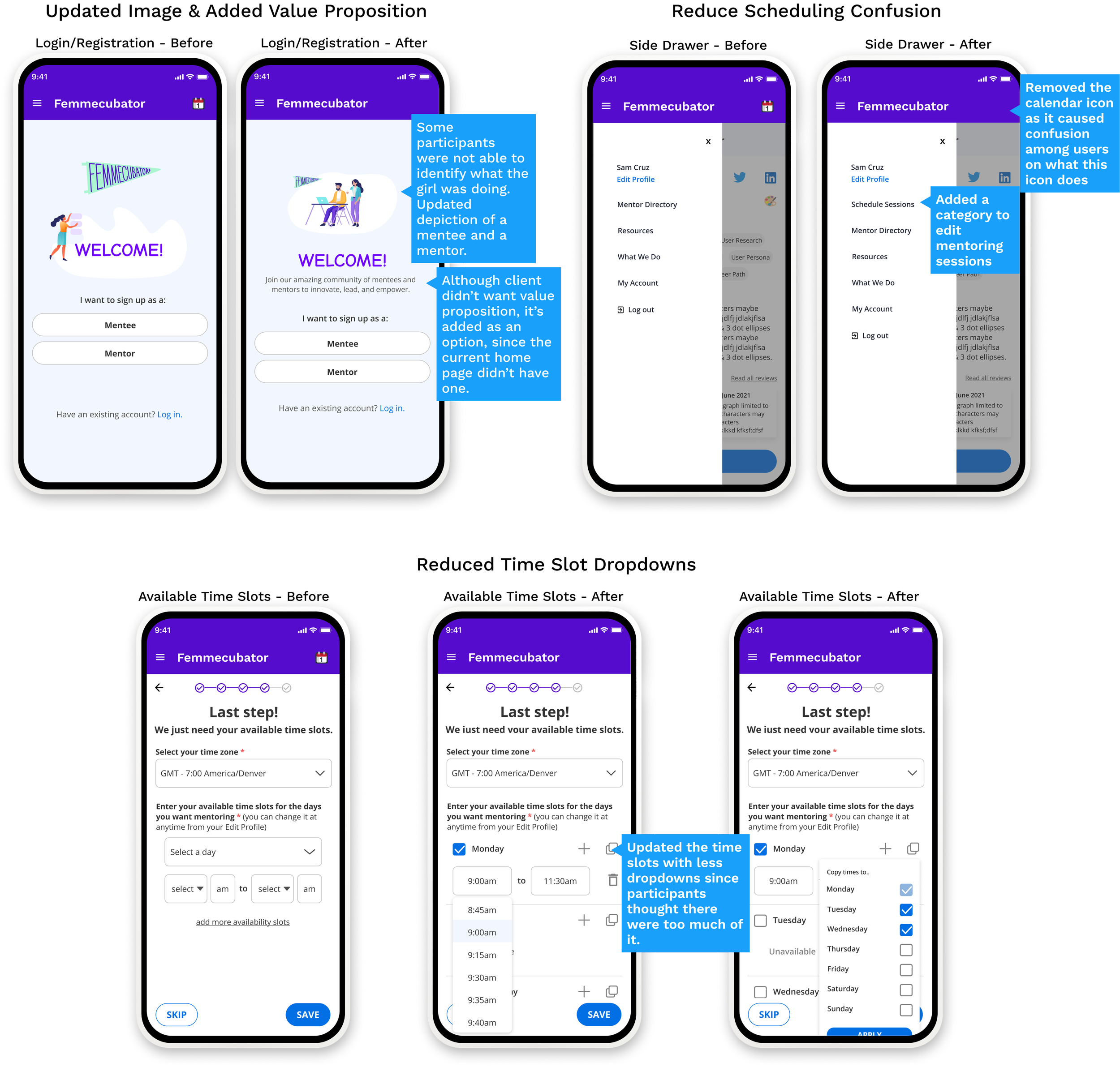 The research from the competitive analysis allowed me to quickly map out how the product can look. The most difficult task was to design the time picker. Since mentors and mentees live in different time zones, I created a time zone picker to help them coordinate.
