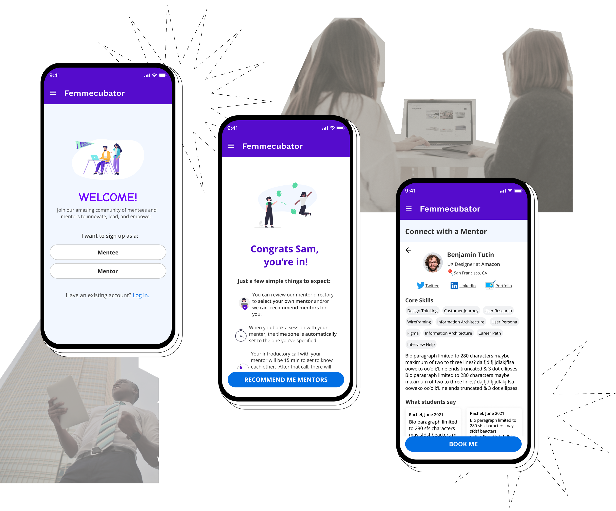 Femmecubator serves as a bridge for women of color (ages 24 to 39) in tech who have a difficult time finding a support system by offering 1:1 mentorship.